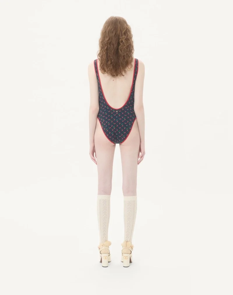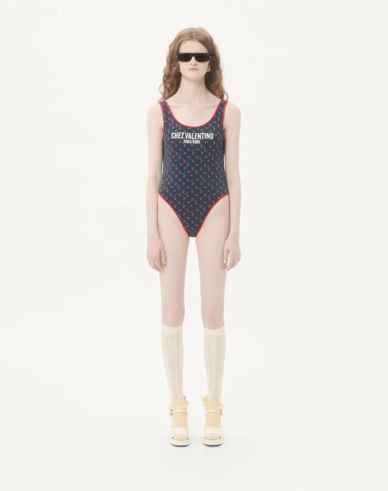 One-piece lycra swimsuit with Cherryfic print and Chez Valentino detail