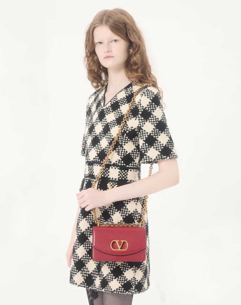 The look of the model is completed by a Valentino Garavani Vain Bag and Valentino Garavani Hotty Shoes.