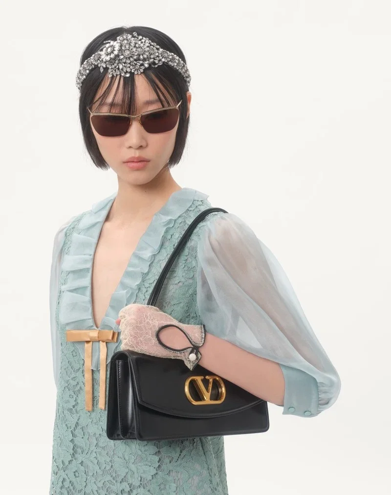 The look of the model is completed by a Valentino Garavani Vain Bag and Valentino Garavani Adamantine Shoes.