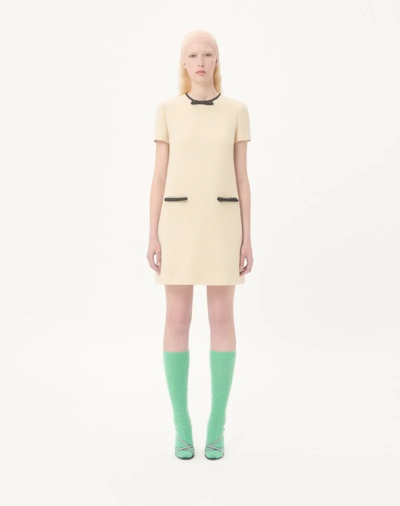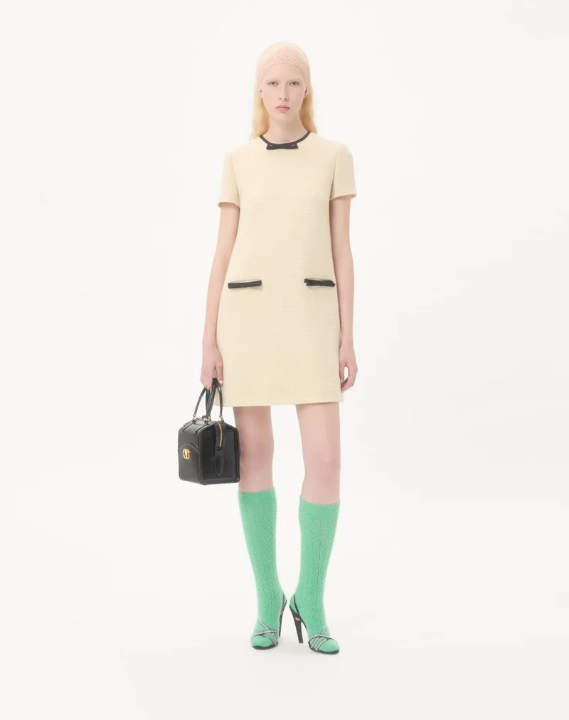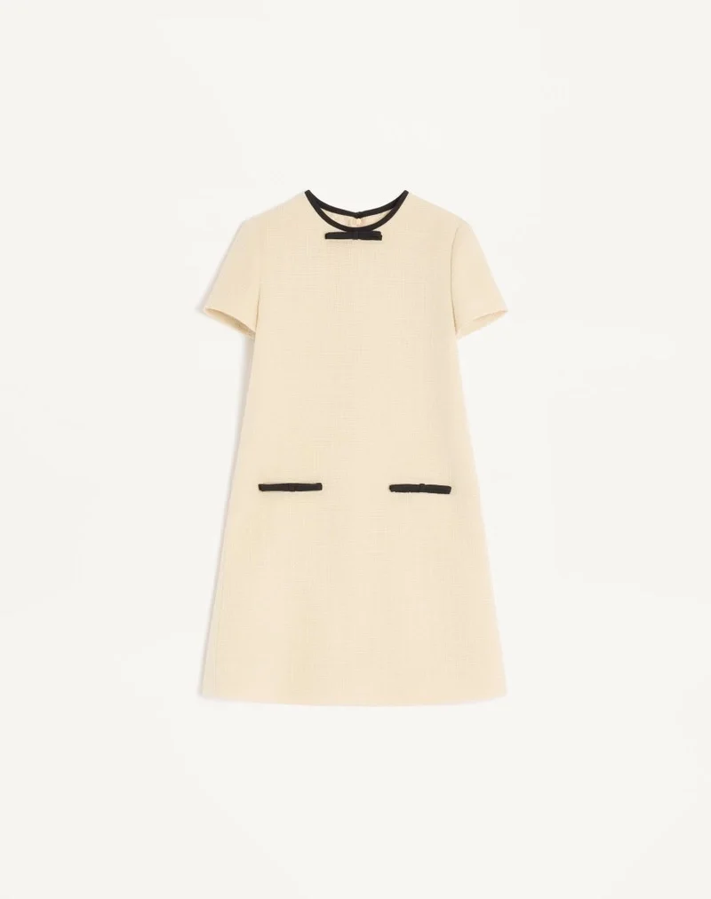 Short Dress in Plain Wool Tweed with contrasting bows in Crepe Couture