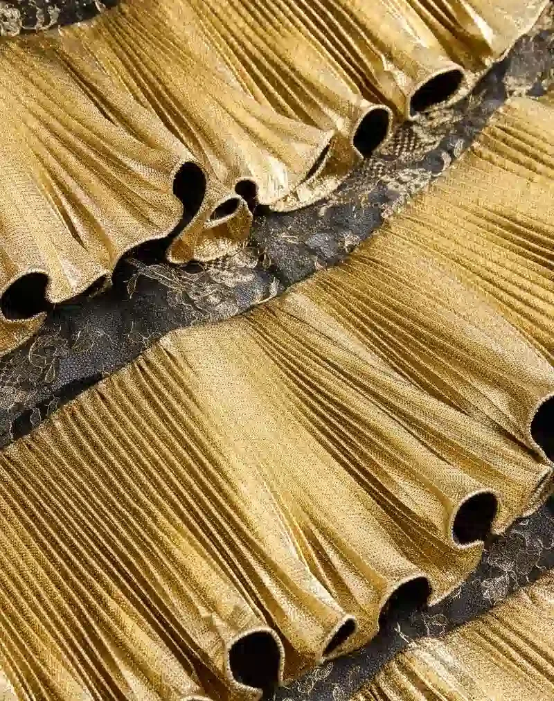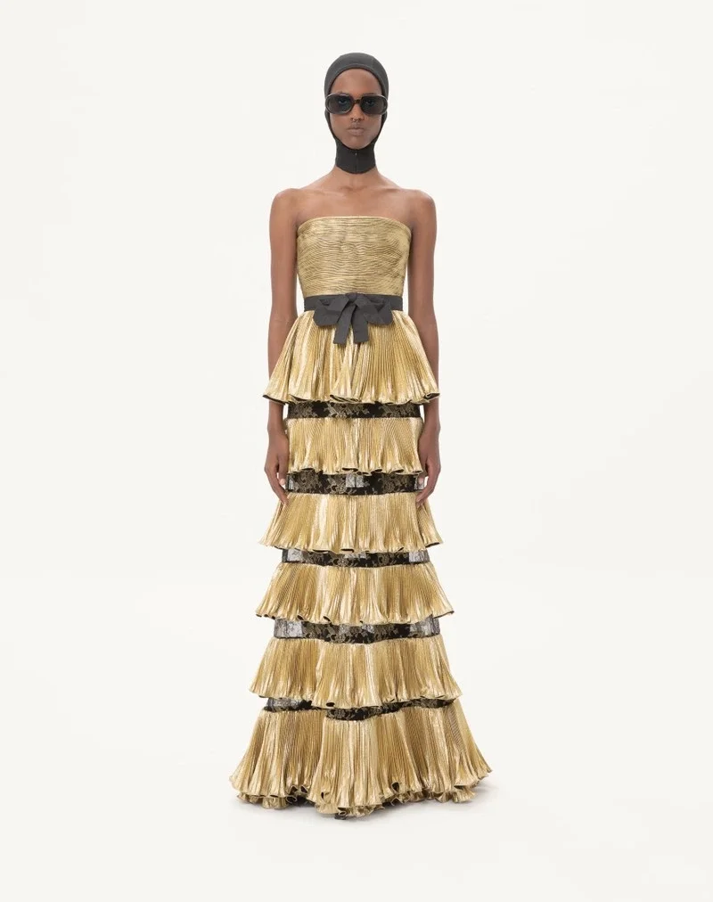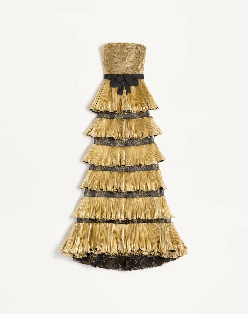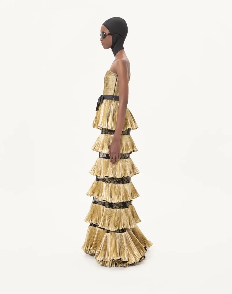 Long dress in Jacquard Reps Lamé with handmade drapes on the bodice and pleated ruffles
