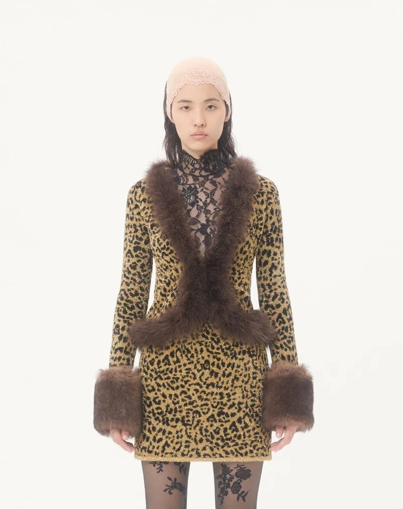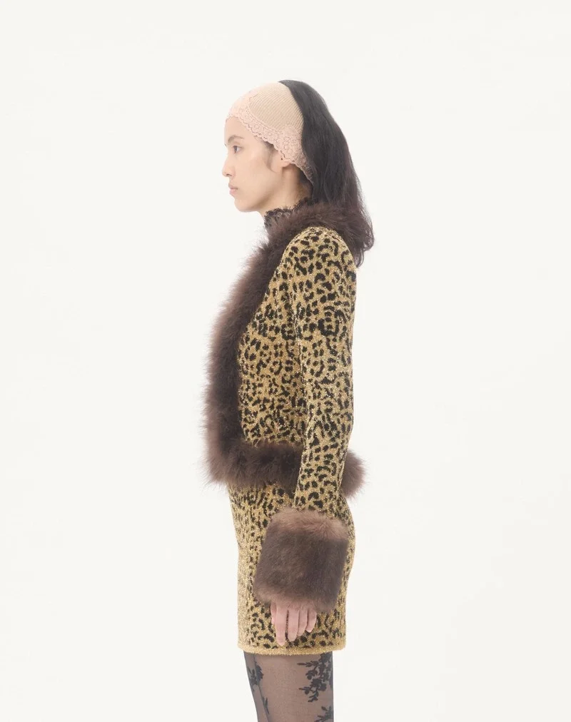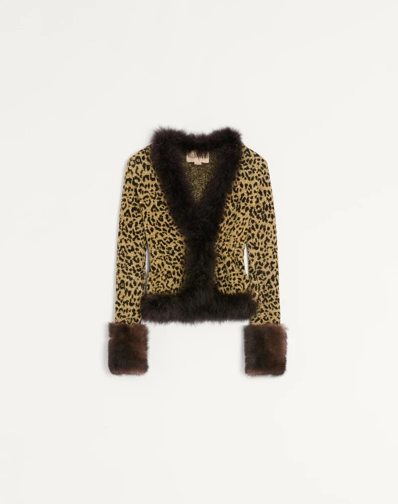 Jacquard animal print Lurex knit jacket with feather trim