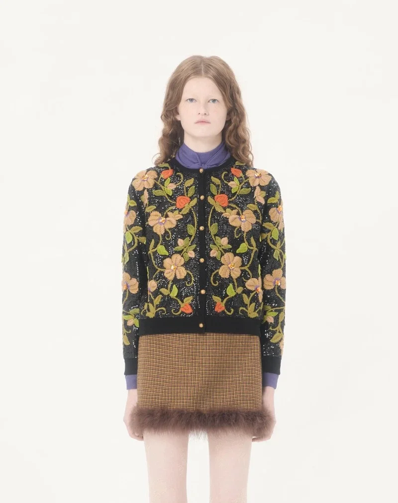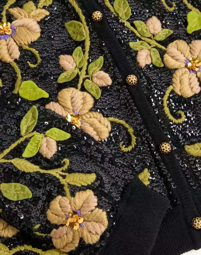 Wool cardigan with all-over sequin embroidery and floral thread embroidery