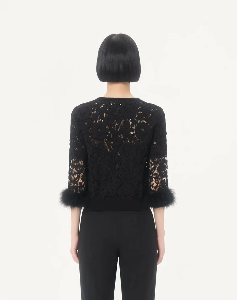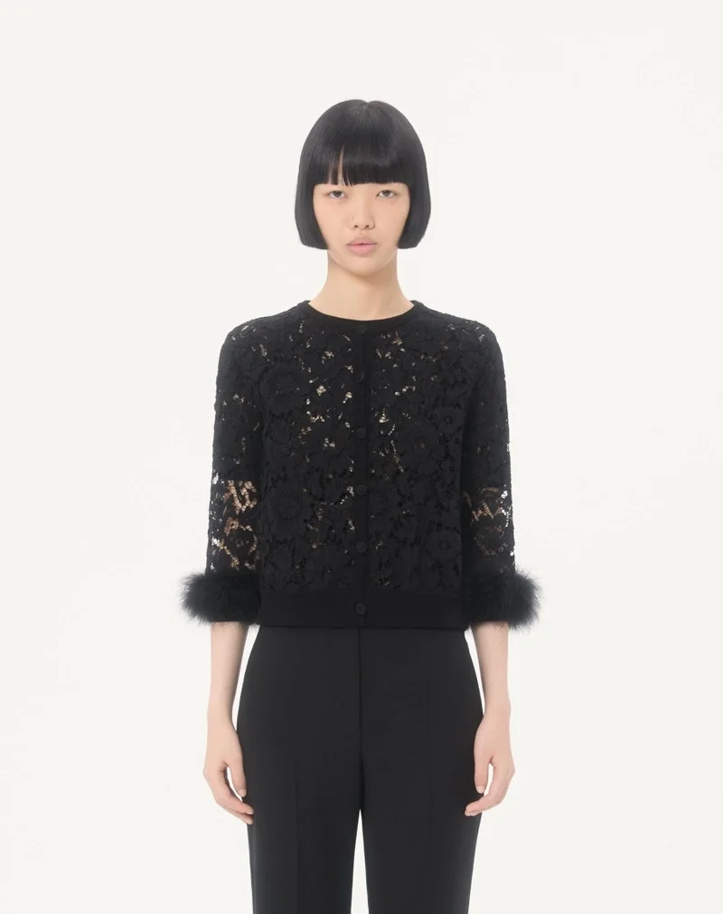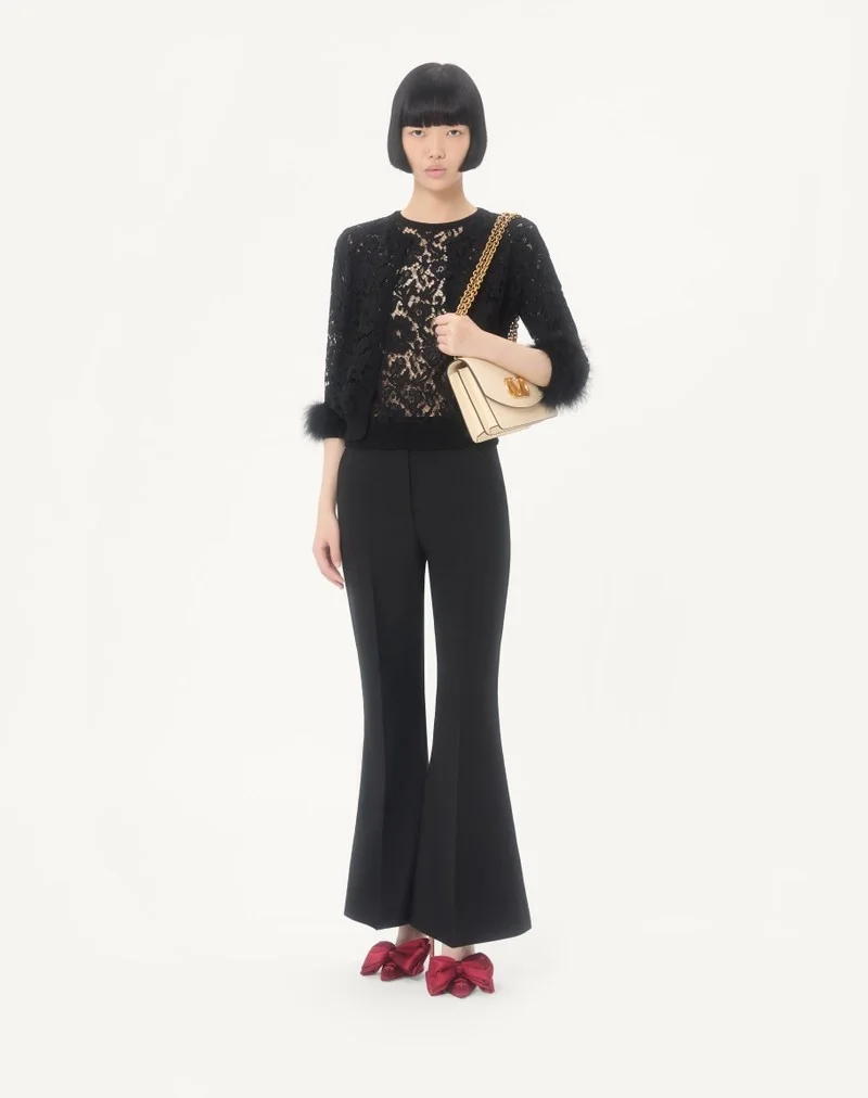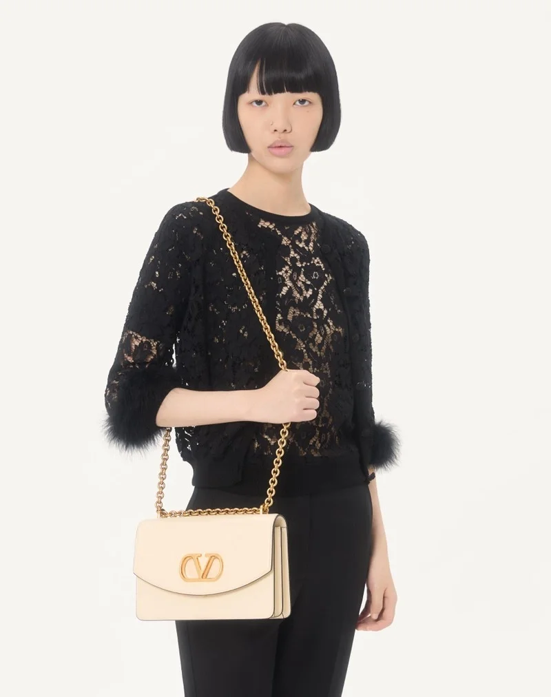 The look of the model is completed by a Valentino Garavani Vain Bag and Valentino Garavani Yolande Shoes.