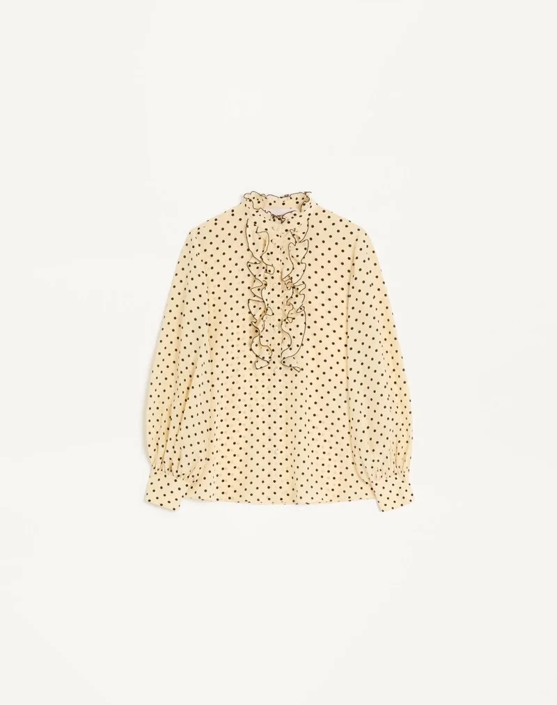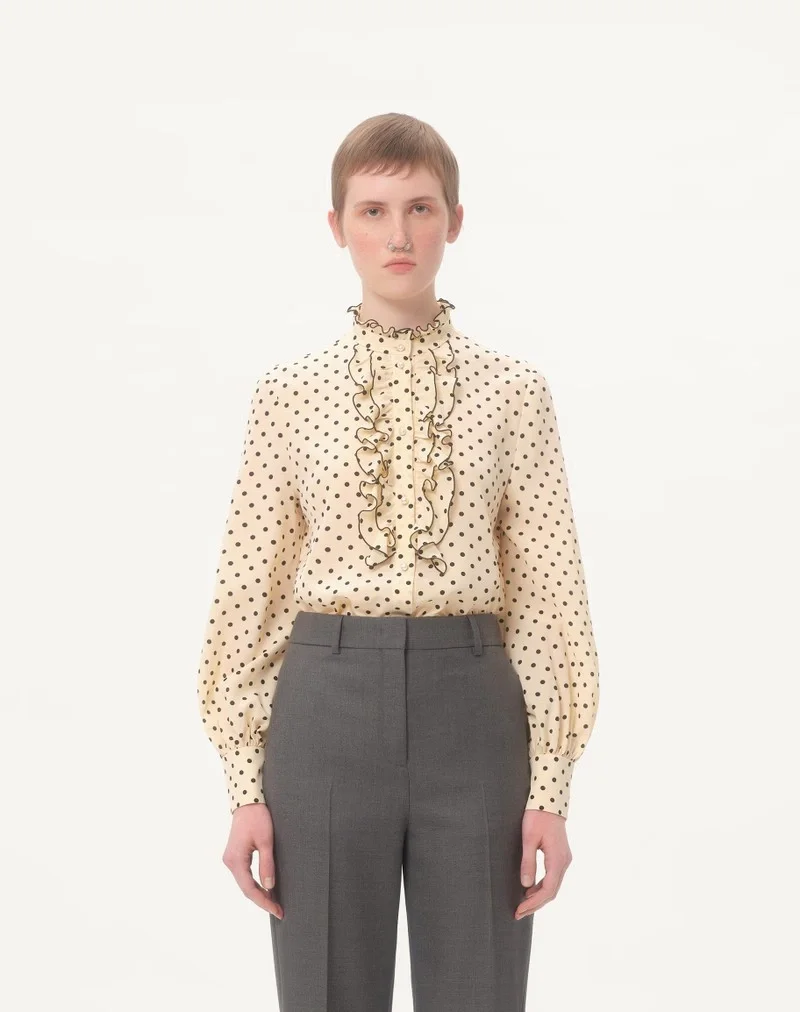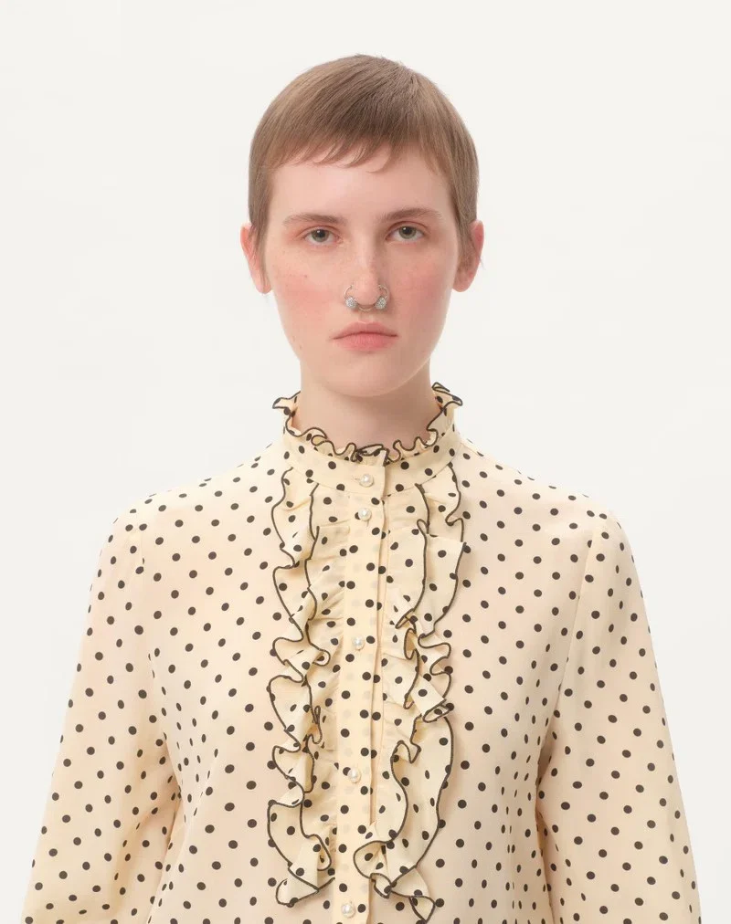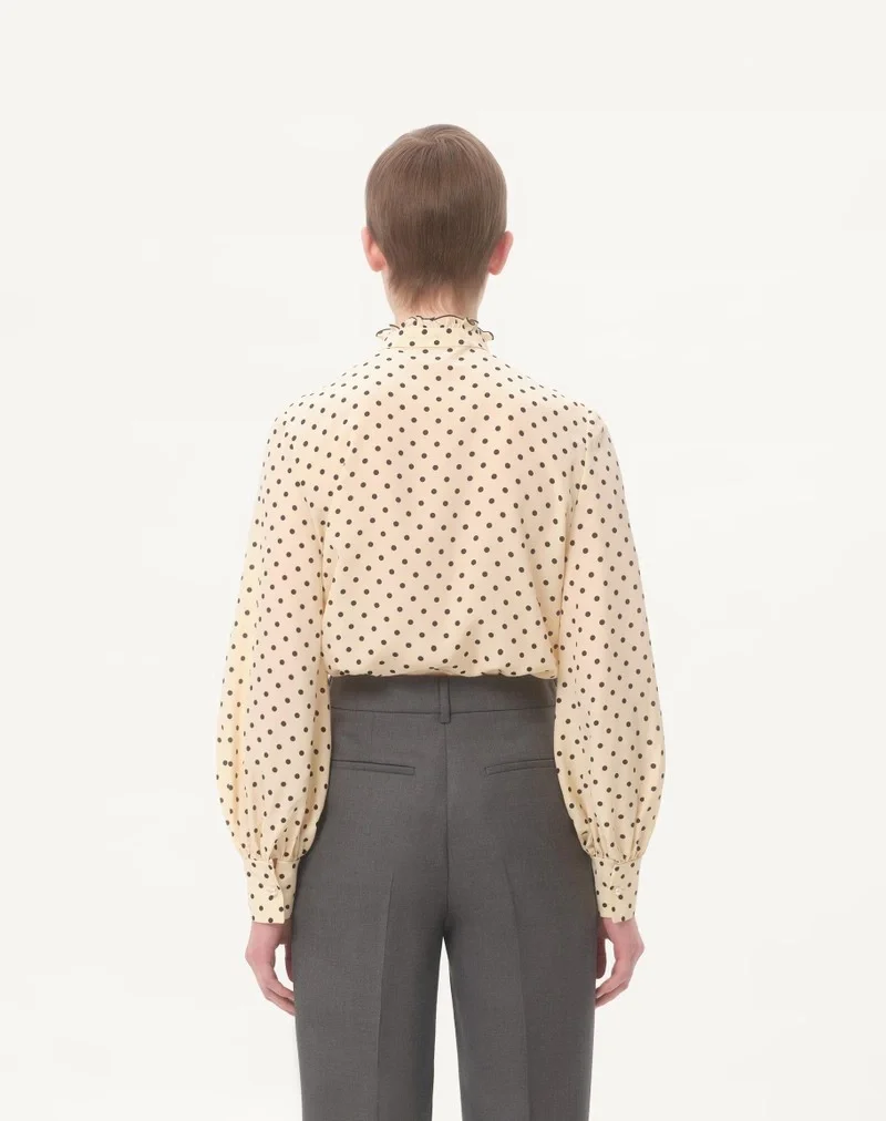 Long-sleeved Crepe de Chine shirt with Plusdepois print with ruffle details