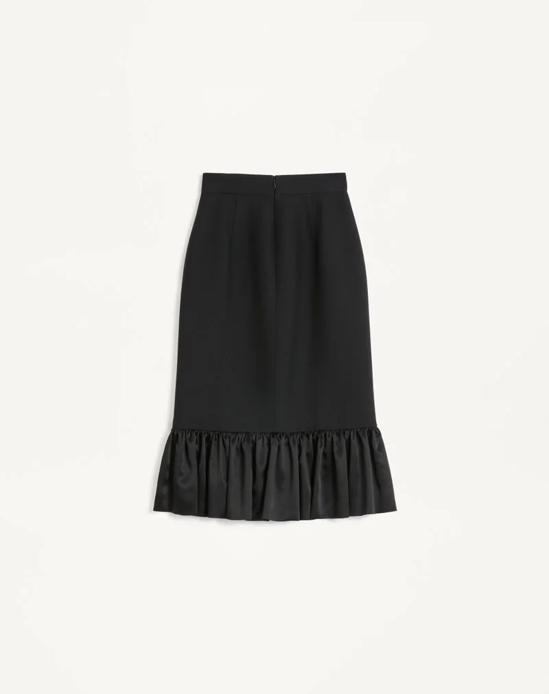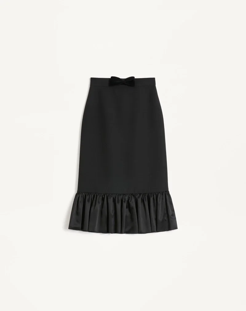 Crepe Couture midi skirt with Satin flounce detail at the bottom and waist belt with velvet bow