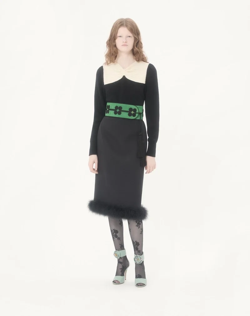 The look of the model is completed by a Valentino Garavani Laseine Bag and Valentino Garavani Drip Rose Shoes.