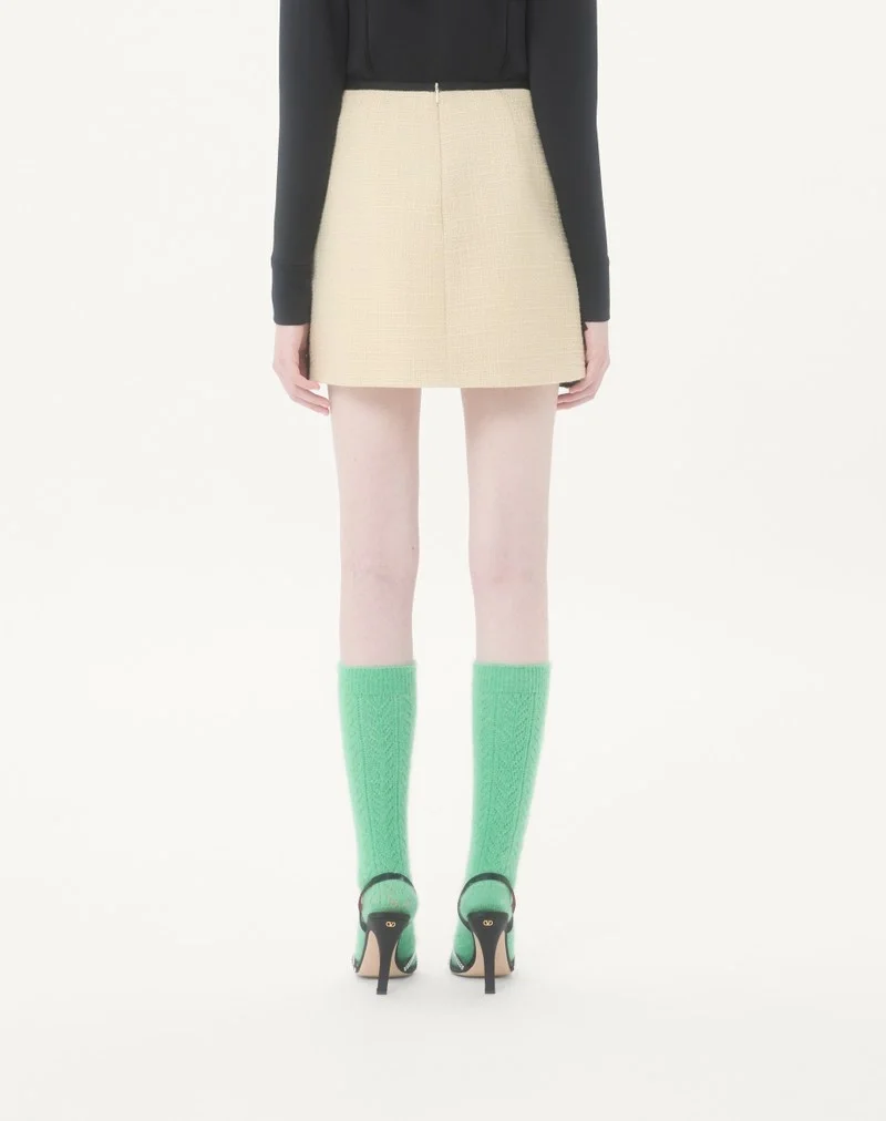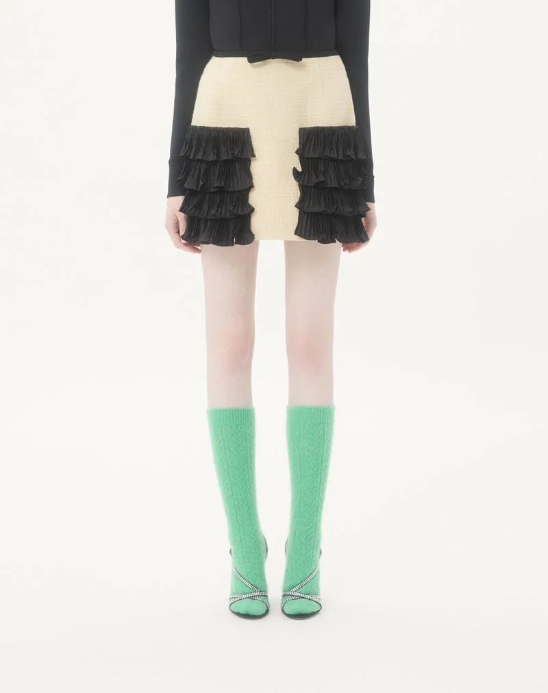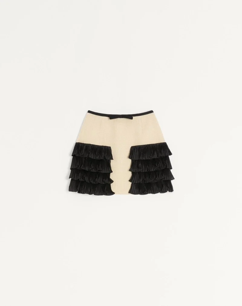 Plain Wool Tweed short skirt with pleated ruffles in Taffeta