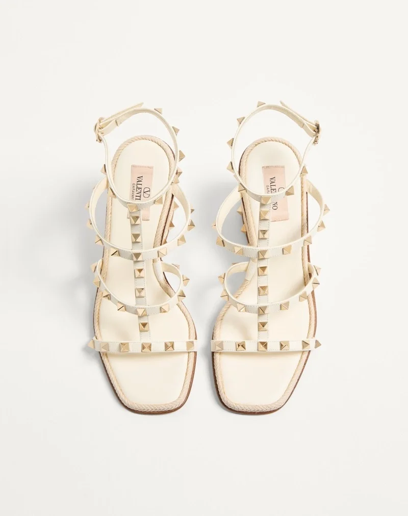 Valentino Garavani Rockstud wedge sandal with straps in calfskin with Cornely raffia-effect cotton embroidery