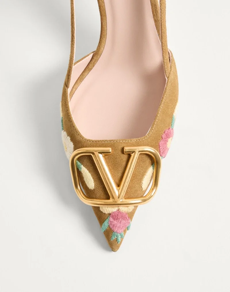Valentino Garavani crust leather slingback pump with floral embroidery and VLogo Signature decoration