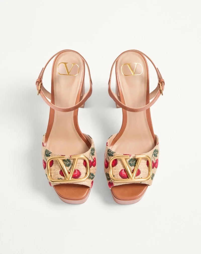 Valentino Garavani platform sandal in synthetic raffia jacquard with Cherryfic motif, leather detailing and VLogo Signature decoration