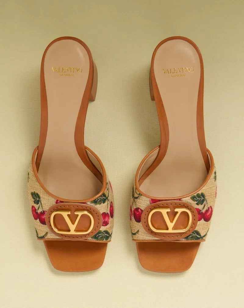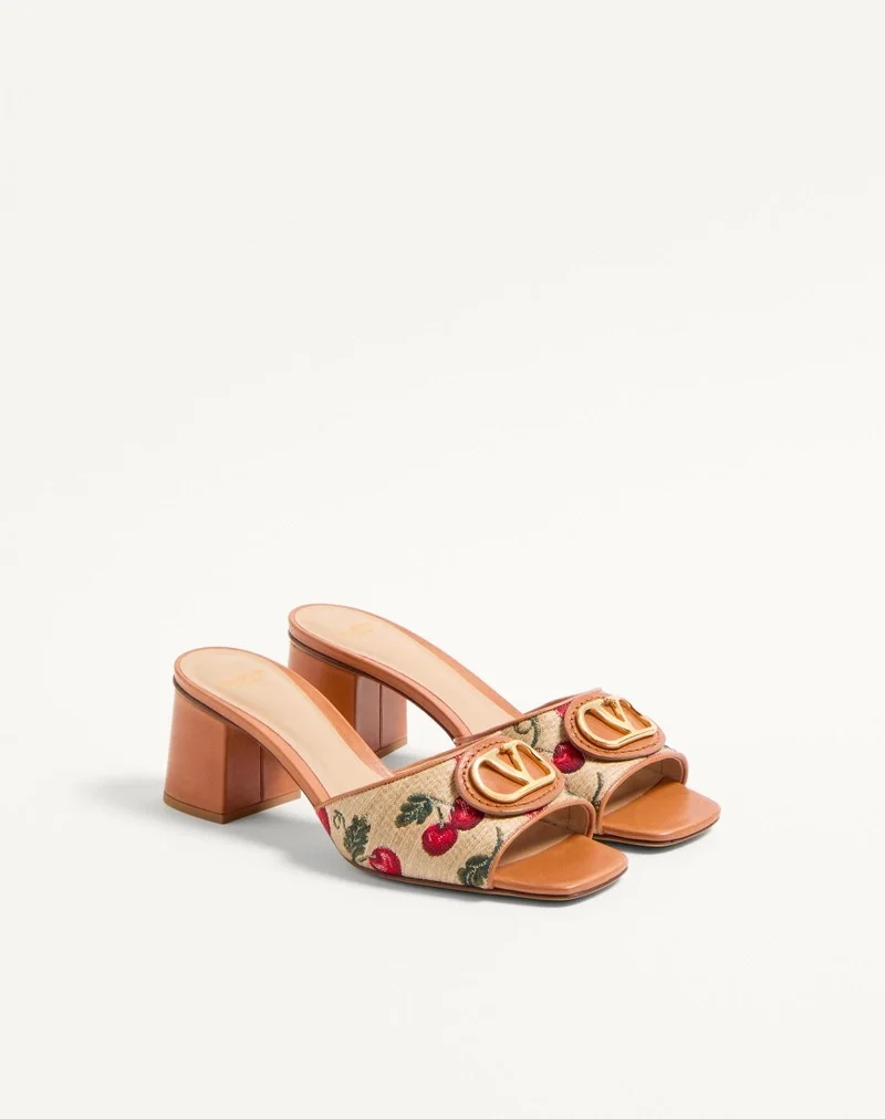Valentino Garavani slide sandal in synthetic raffia jacquard with Cherryfic motif, leather detailing and VLogo Signature decoration