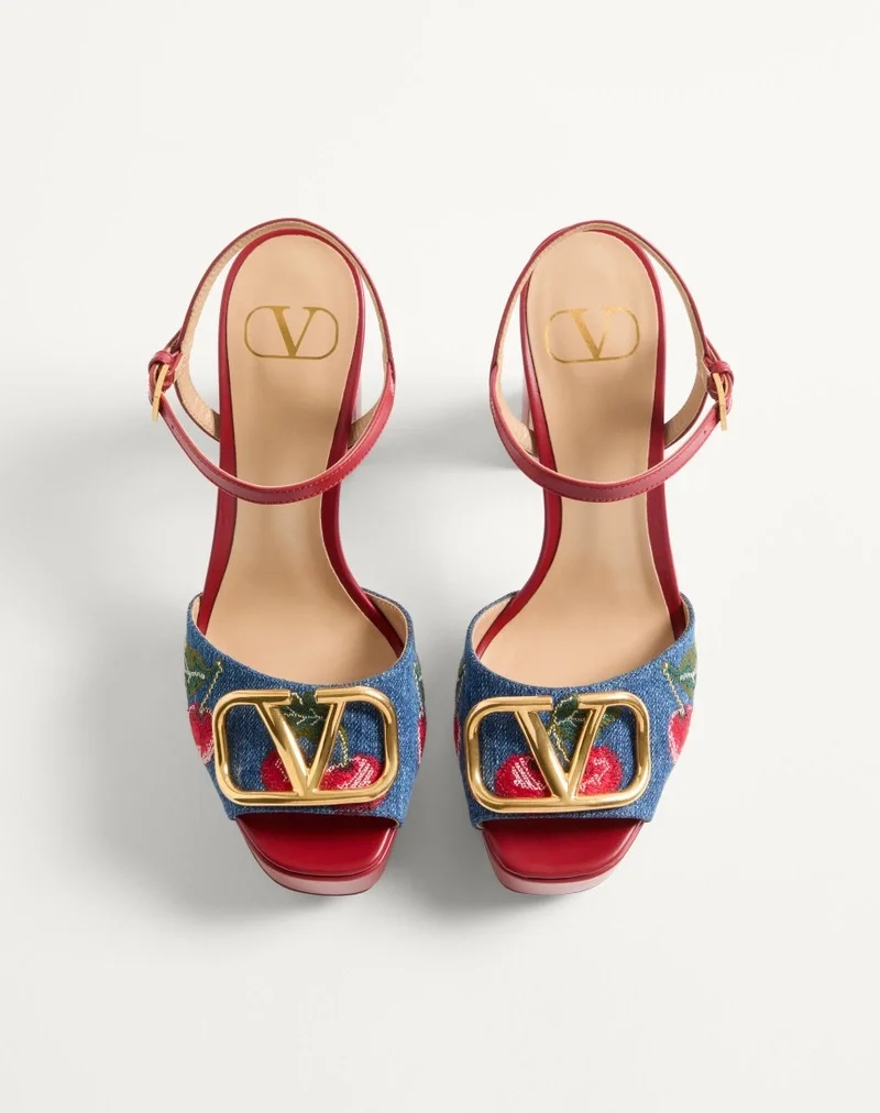 Valentino Garavani platform denim sandal with Cherryfic embroidery, leather details and VLogo Signature decoration