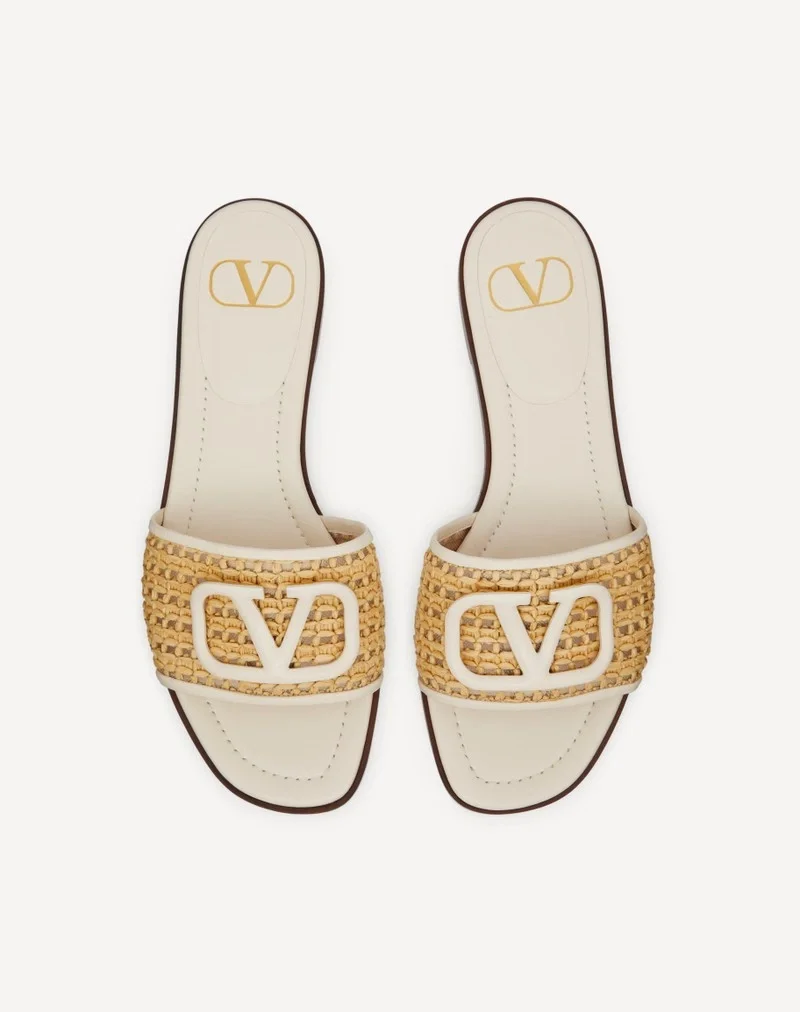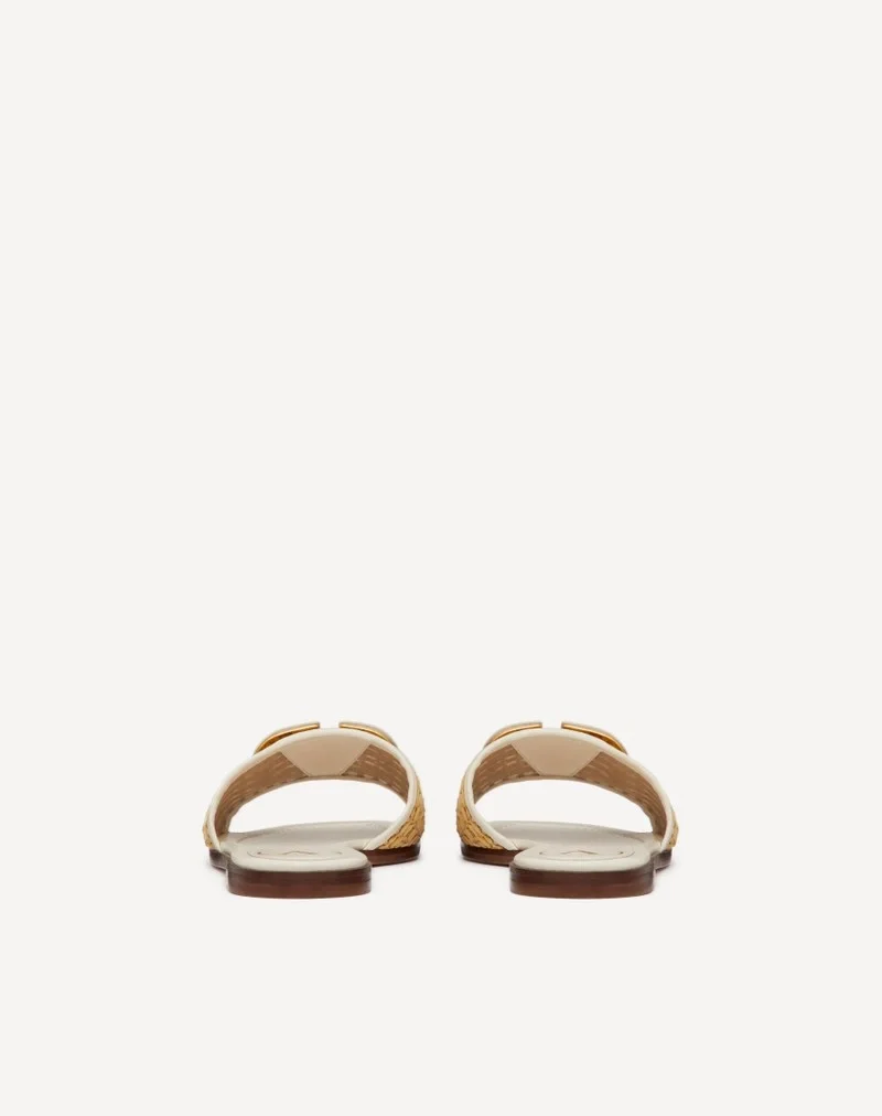Valentino Garavani slide sandal in woven synthetic raffia, leather details and VLogo Signature decoration